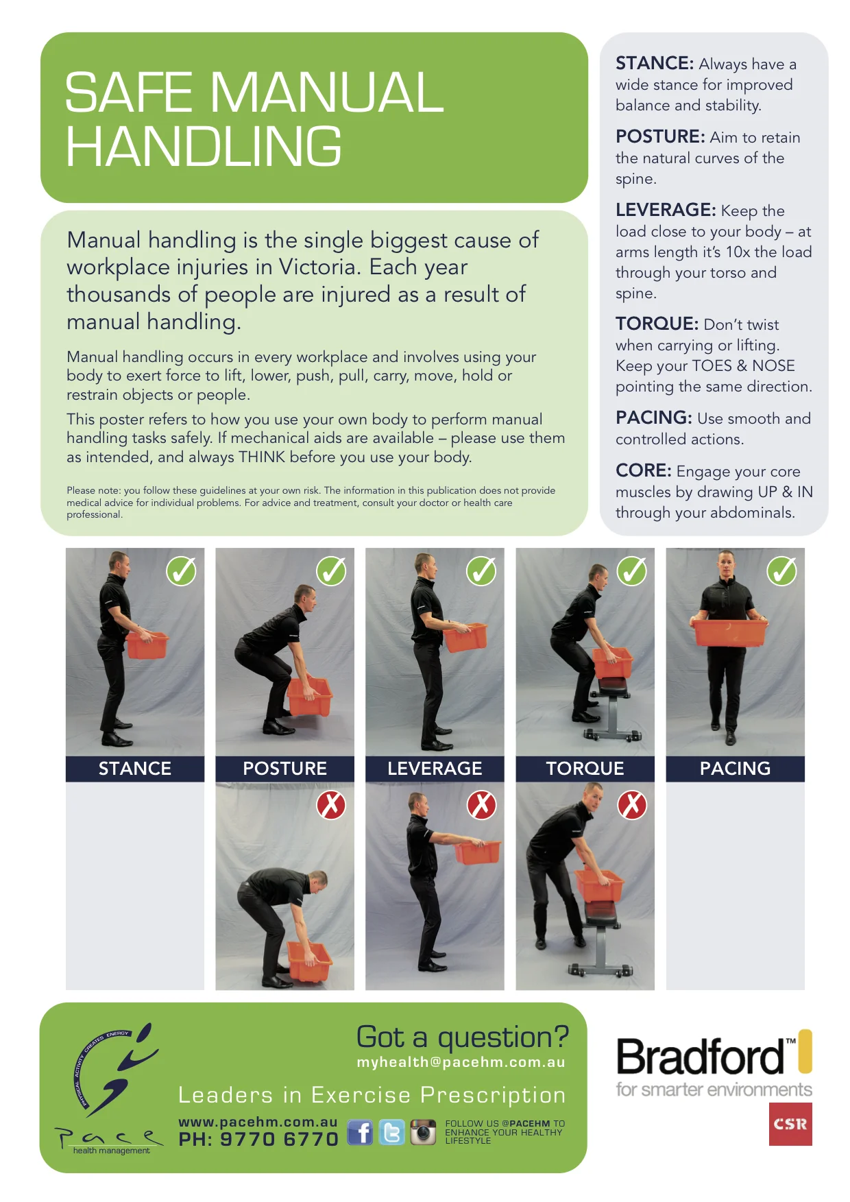 - Highlight the potential physiological risks and impact of injuries (both physical, psychological and social) associated with poor posture, manual handling and repetitive movement.